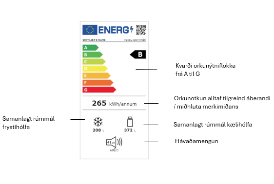 Hér má sjá útskýringu á orkumerkingu kælitækis og hvað kostar að reka hann á ári.