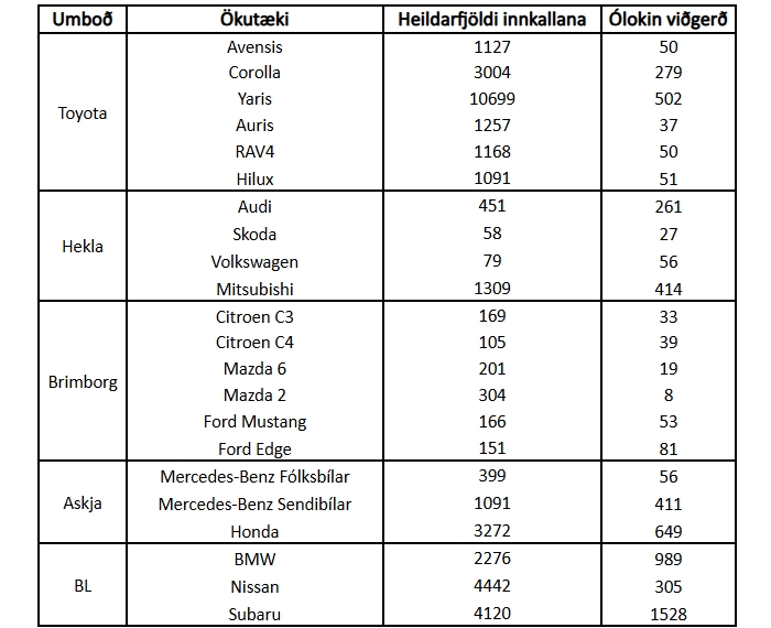 - Toyota: 18.346 bílar innkallaðir, 969 óviðgerðir (5% ólokið), mest hjá Yaris, 502 bílar óviðgerðir og Corolla 279 bílar óviðgerðir.